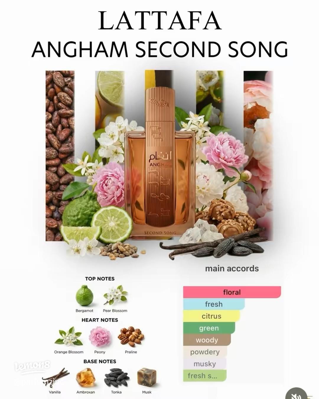 Angham Second Song de Lattafa Perfumes est un parfum Floral Fruité Gourmand pour femme. C’est un nouveau parfum. Angham Second Song a été lancé en 2026. Les notes de tête sont Fleur de poirier et Bergamote; les notes de coeur sont Pivoine, Fleur d’oranger et Praliné; les notes de fond sont Vanille, Musc, Ambroxan et Fève de tonka.